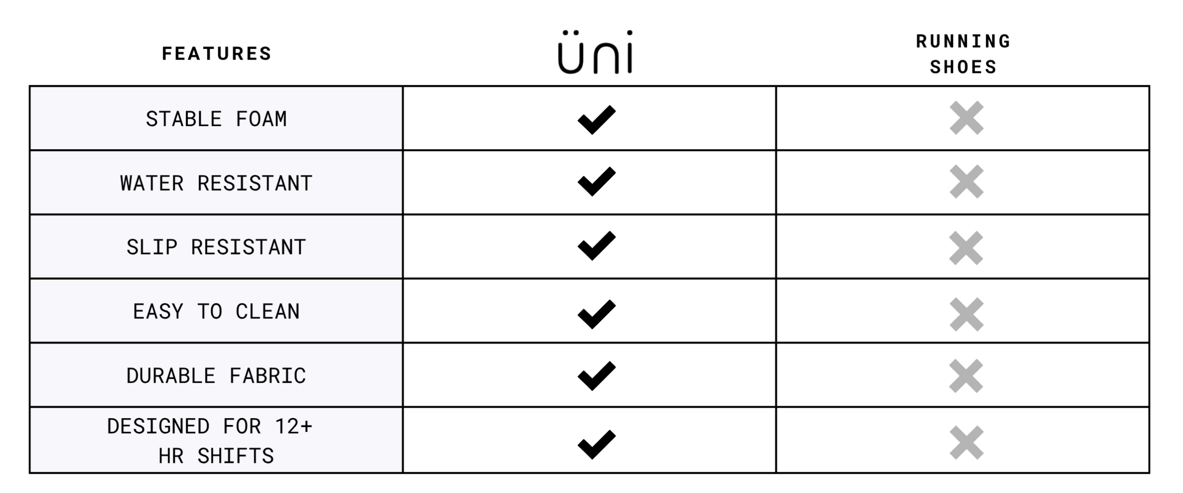 The Üni Perform is designed for professionals who move nonstop. Its DuraShell™ upper is fluid- and stain-resistant yet breathable, keeping your feet dry and fresh through long shifts. A memory foam ankle guard and high-performance OrthoLite® insole deliver all-day comfort and responsive support, while the stable midsole promotes proper alignment and reduces fatigue. With a wide toe box for natural swelling and a slip-resistant outsole certified to ASTM F3445 standards, this shoe is made to keep up—on the floor, in motion, and beyond.